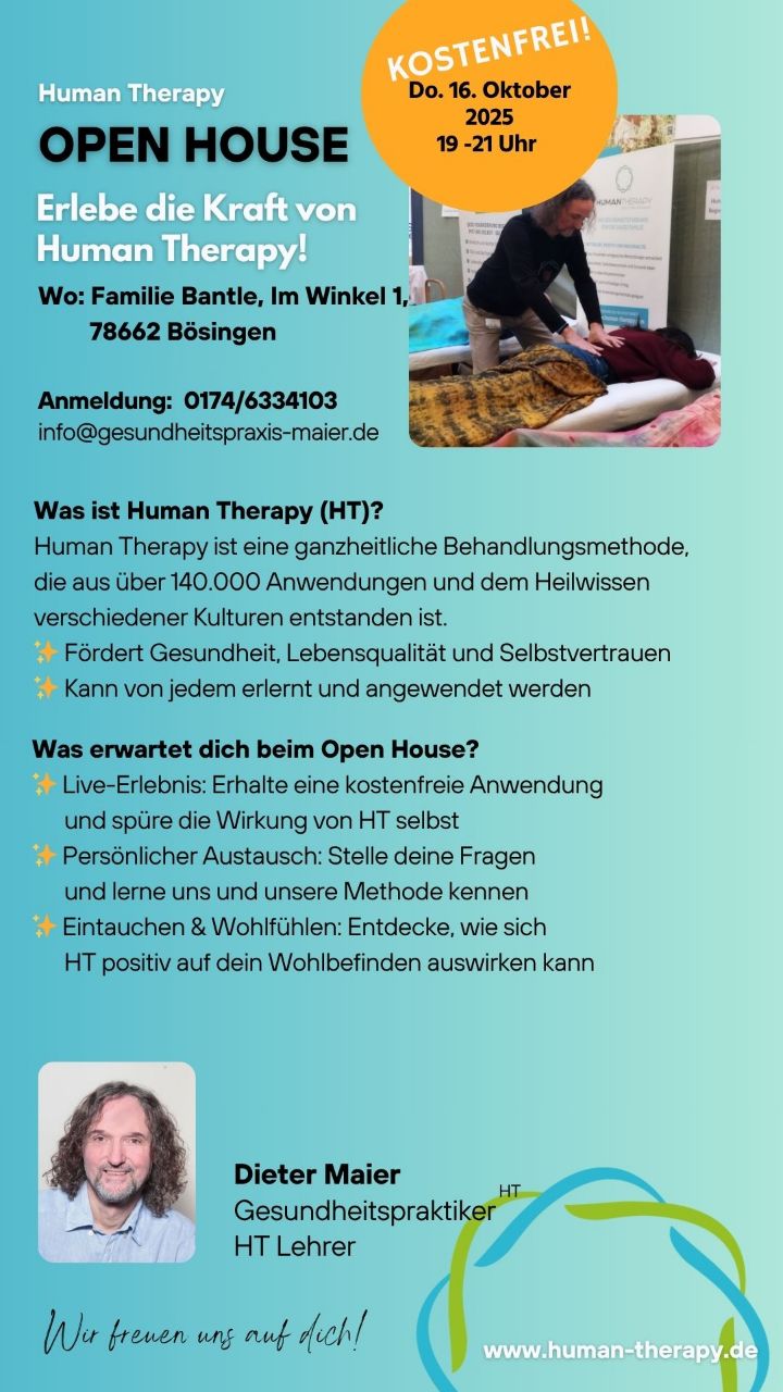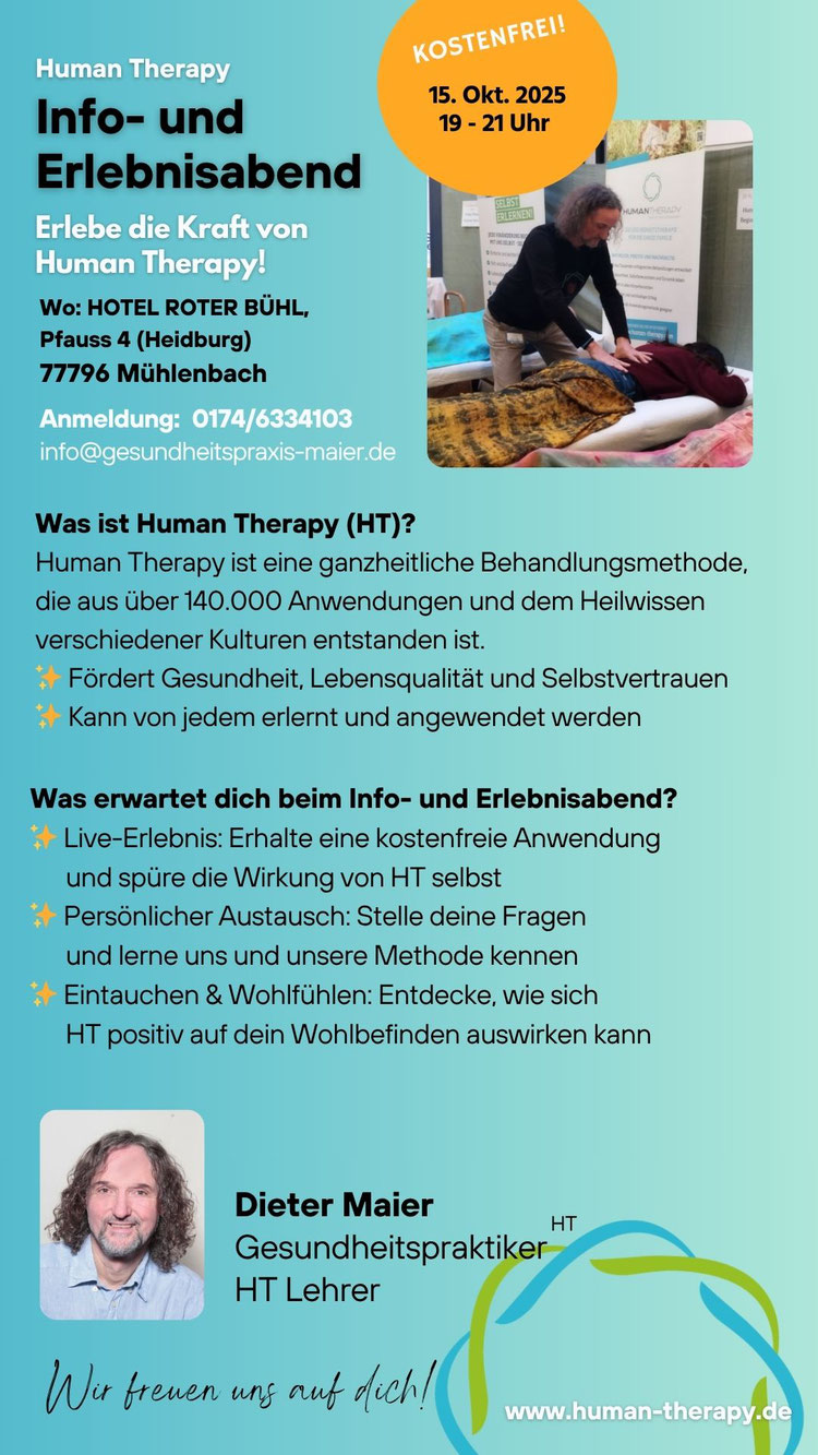 In diesem 3 Tage Seminar erlebst Du in den praktischen Anwendungen die hohe Wirksamkeit von Human Therapy. Dabei erfährst Du die befreiende Wirkung sowohl auf der körperlichen, als auch auf der emotionalen Ebene.